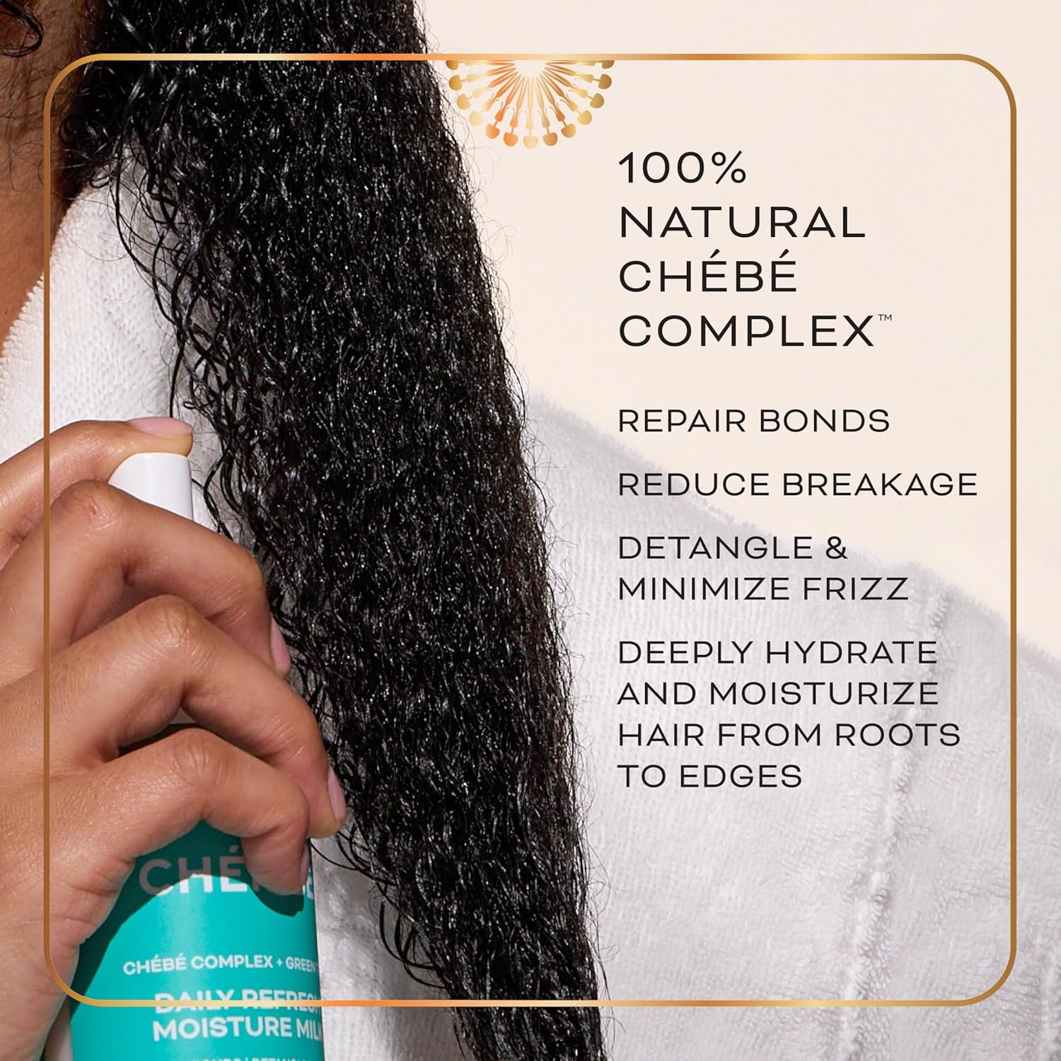 Bring your hair back to life with CHERIBE Daily Refresh Hair Milk, a lightweight, leave-in CHEBE moisturizing spray, specially crafted for frizz control of dry, curly, coily, and kinky hair types (2A-4C). Whether you wear your hair natural, relaxed, in protective styles, or anything in between, CHERIBE supports your hair goals from root to tip. Unlike traditional Chebe hair powder and oil, our 100% natural, patented CHEBE COMPLEX™ is at the core of all CHERIBE formulas – the first of its kind designed to repair the three main types of hair bonds essential for textured hair health. It penetrates deeply into each strand, adapting to your hair’s specific damage levels to restore strength and vitality. Enriched with antioxidant-rich GREEN TEA to help protect the scalp and strands + VITAMIN E to boost shine and promote healthy hair growth, this lightweight CHEBE leave-in daily hair milk spray hydrates, repairs, and restores elasticity. It detangles effortlessly while giving your hair a soft, manageable finish without weighing hair down or leaving buildup. From waves and curls to tight coils and 4C textures, CHERIBE makes everyday styling easier while supporting long-term hair health. Our signature CHEBE GARDEN FRAGRANCE is inspired by early mornings on our regenerative farm in Chad, Central Africa, and delights the senses with refreshing notes of greens, fruits, and florals. Free from sulfates (SLS/SLES), silicones, parabens, phthalates, animal testing, artificial dyes, drying alcohols, mineral oils, and phenoxyethanol, this clean formula is gentle enough for daily use and safe for color-treated and chemically processed hair. For best results, CHERIBE Hair Milk Spray can be used on wet or dry hair. Spritz from scalp to ends as needed to detangle, moisturize, and minimize breakage. and protect against daily wear and tear. For those interested in a comprehensive hair care routine, CHERIBE offers a range of complementary products featuring the CHEBE COMPLEX™, such as hair repair conditioners, masks, and leave-in treatments.
